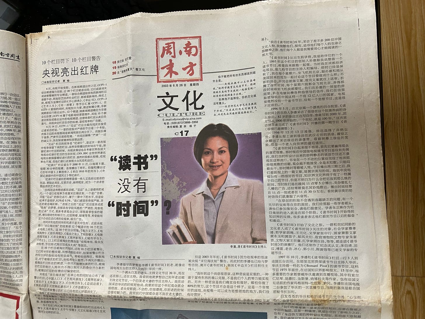 《南方周末》写了篇《“读书”没有“时间”》的报道,去回顾这个节目的历程,试图找到它的困境的来源,还配了另一个半版,去分析带给《读书时间》这档节目巨大鼓舞的法国,如何《在“夜晚与夏天”看文化》,并请学者探讨商业大潮已经不可阻挡的中国《公共电视的缺席》。
